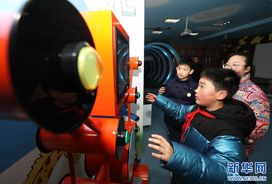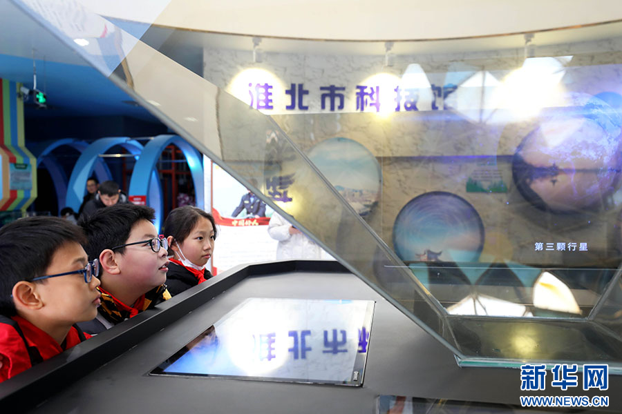1月1日,孩子们在安徽省淮北市科技馆里参观科普装置。