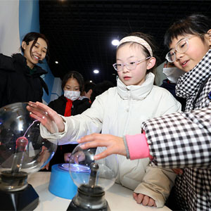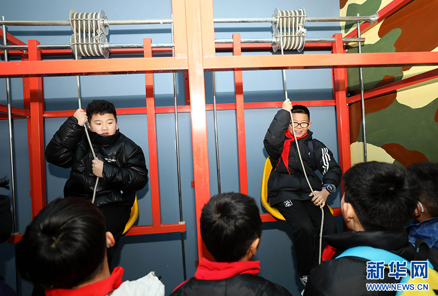 1月1日,孩子们在安徽省淮北市科技馆里体验科普装置。