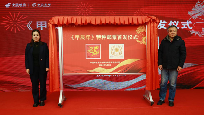 1月5日上午,中国邮政集团有限公司合肥市分公司在天鹅湖大酒店举行《兔辞玉乾坤·龙吟春正好》甲辰年特种邮票首发活动。