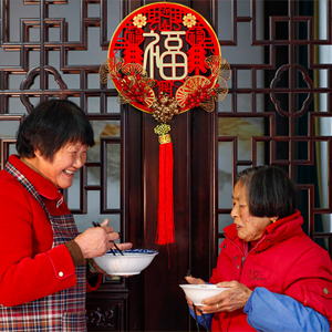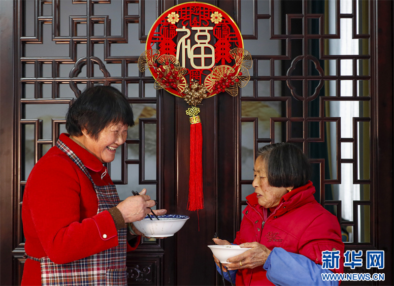 1月18日,安徽省黄山市徽州区潜口镇村民胡爱花和家人在品尝徽州特色腊八粥。