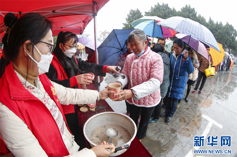 1月18日,村民在黄山市潜口镇金紫祠广场免费领取徽州特色腊八粥。