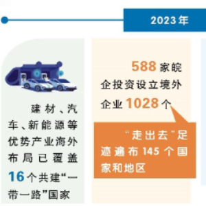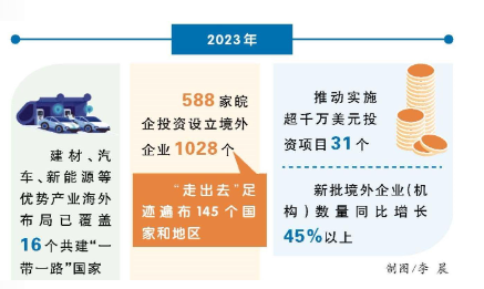 去年,通过深度服务和融入共建“一带一路”,我省对外投资合作实现了新提升。重点产业布局扩面增效,对共建“一带一路”国家实际投资同比增长14%、对外承包工程完成营业额同比增长14.4%,建材、汽车、新能源等优势产业海外布局已覆盖沿线16个国家。588家皖企投资设立境外企业1028个,“走出去”足迹遍布145个国家和地区。