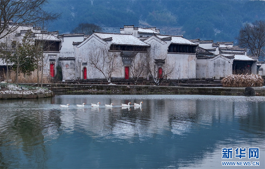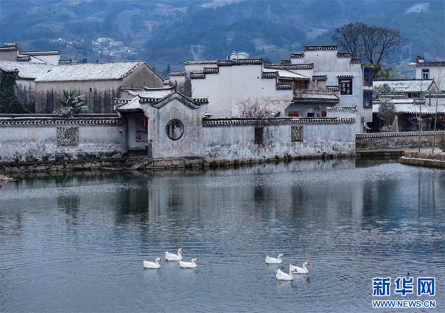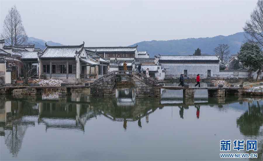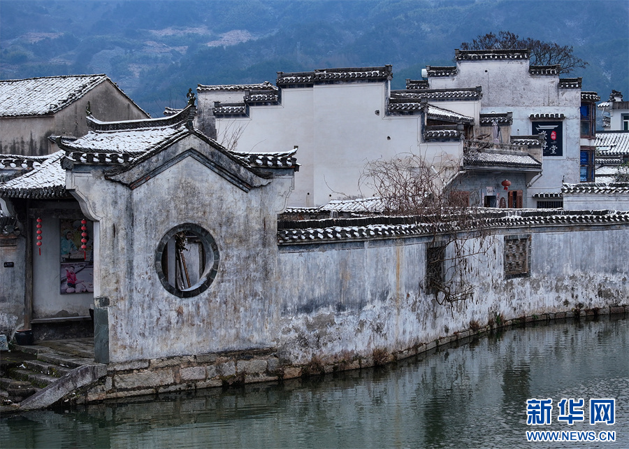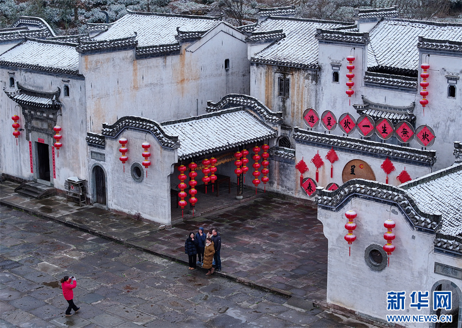 当日,受寒潮影响,安徽省黄山市徽州区呈坎古村落迎来新年首场降雪,粉墙黛瓦的徽派古民居银装素裹,如梦似幻,令人流连忘返。新华网发(施亚磊 摄)