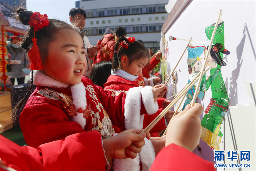 1月24日,在安徽省黄山市屯溪示范幼儿园,小朋友在表演皮影戏。