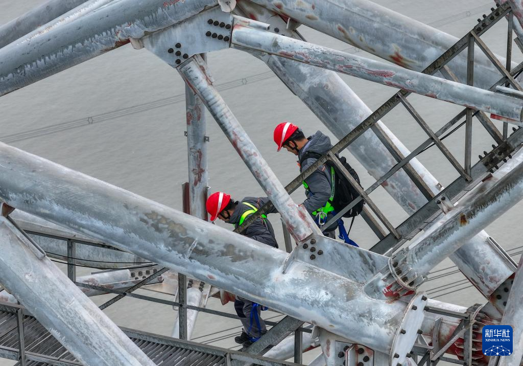 2月2日,张洲在1000千伏淮芜线长江大跨越北站电塔上作业。