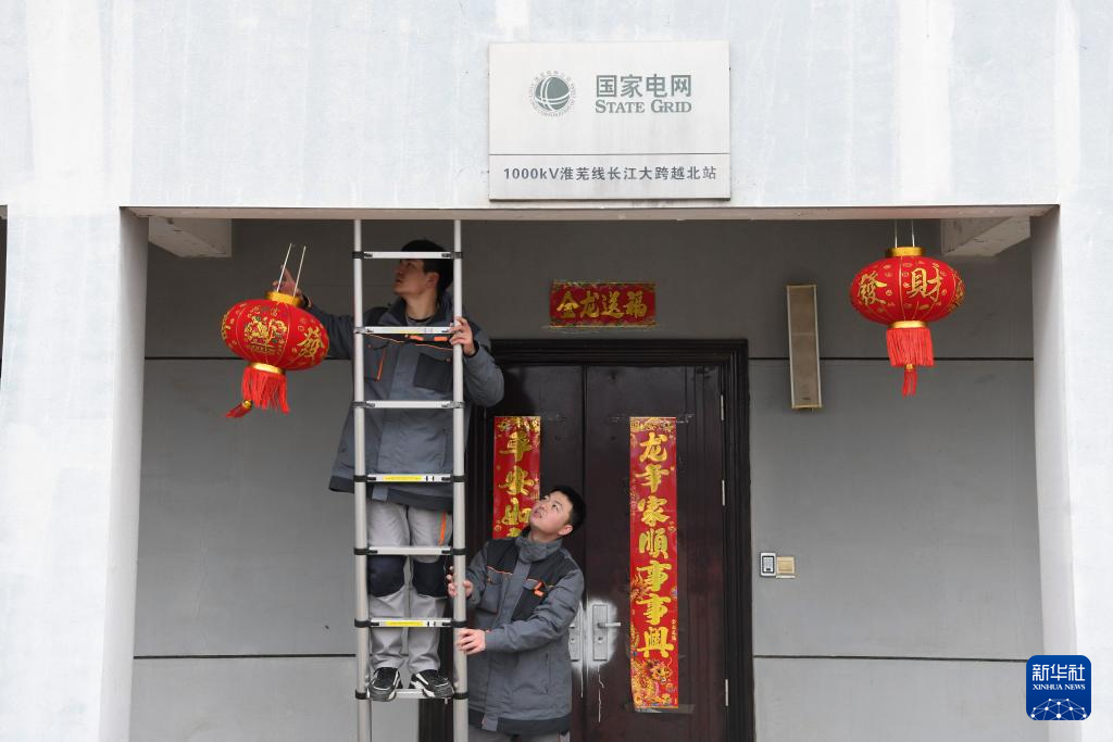 2月2日,张洲(右)和张磊磊在1000千伏淮芜线长江大跨越北站驻地挂灯笼迎新春。