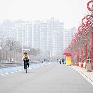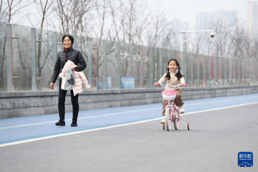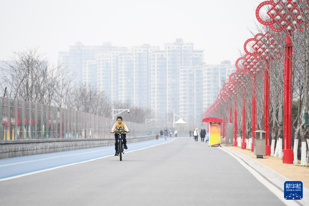 2024年1月30日,小朋友在位于安徽省芜湖市的十里江湾公园骑行。新华社记者 张端 摄
