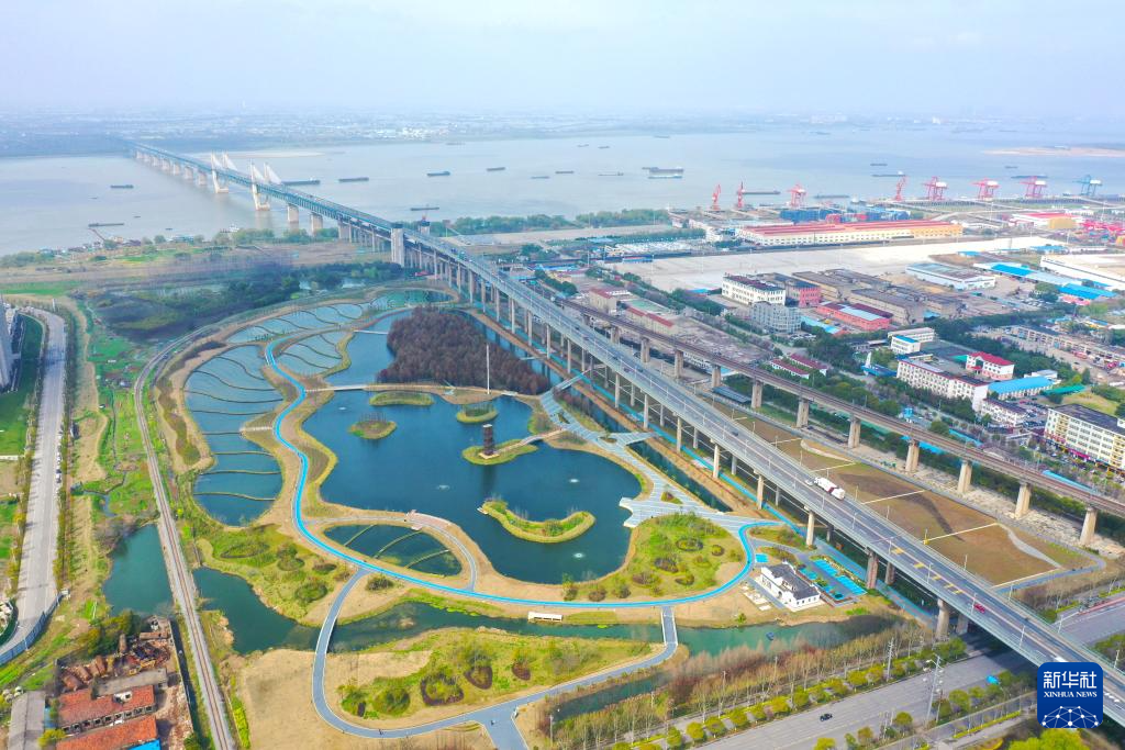 2022年10月25日拍摄的安徽省芜湖市的江东水生态公园(无人机照片)。这里既是滨江公园,也是一个用技术手段打造的生态净水系统。新华社发(朱志刚 摄)