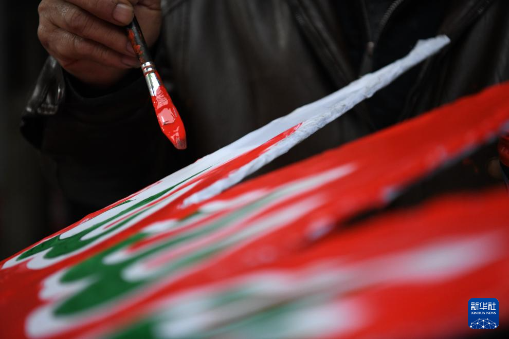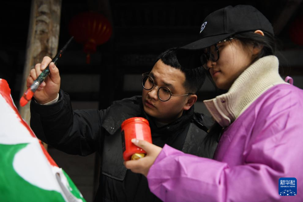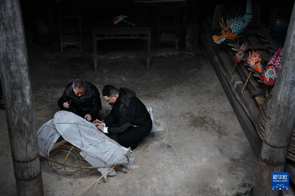 2024年2月4日,在安徽省黄山市歙县瞻淇村,瞻淇鱼灯非遗传承人汪宇昉(右)和村民沙灶春在制作鱼灯。汪宇昉从12岁起跟着沙灶春学习鱼灯制作技艺。新华社记者 张端 摄