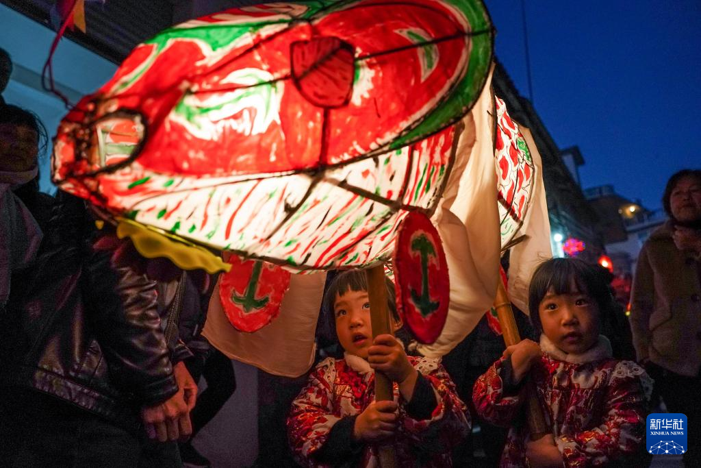2023年1月31日,在安徽省黄山市歙县,瞻淇鱼灯表演队伍在村中穿梭。新华社记者 杜宇 摄