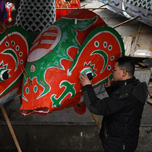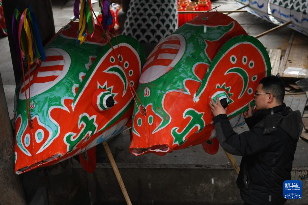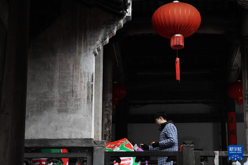 2024年2月4日,在安徽省黄山市歙县瞻淇村,回乡的大学生汪宇新在制作鱼灯。新华社记者 张端 摄