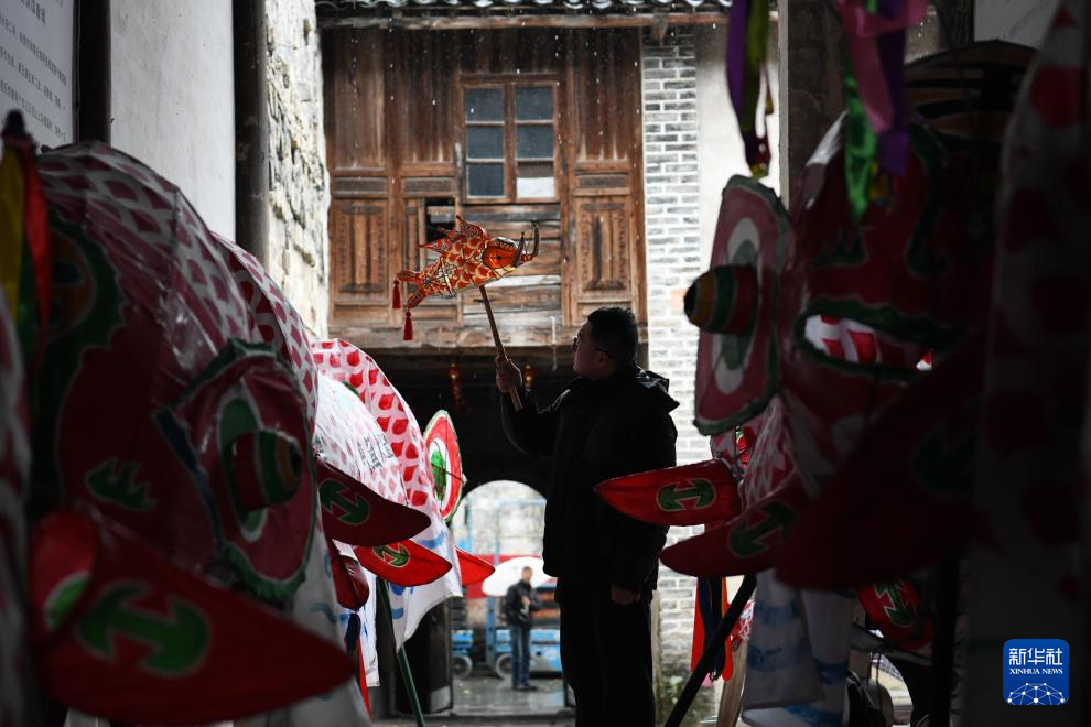 2024年2月4日,在安徽省黄山市歙县瞻淇村,瞻淇鱼灯非遗传承人汪宇昉在一处祠堂里展示他制作的鱼灯。新华社记者 张端 摄