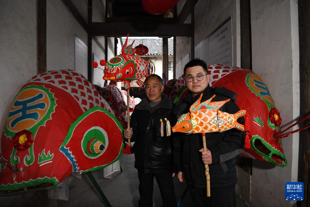 2024年2月4日,在安徽省黄山市歙县瞻淇村,瞻淇鱼灯非遗传承人汪宇昉(右)和教他鱼灯制作技艺的村民沙灶春合影。新华社记者 张端 摄