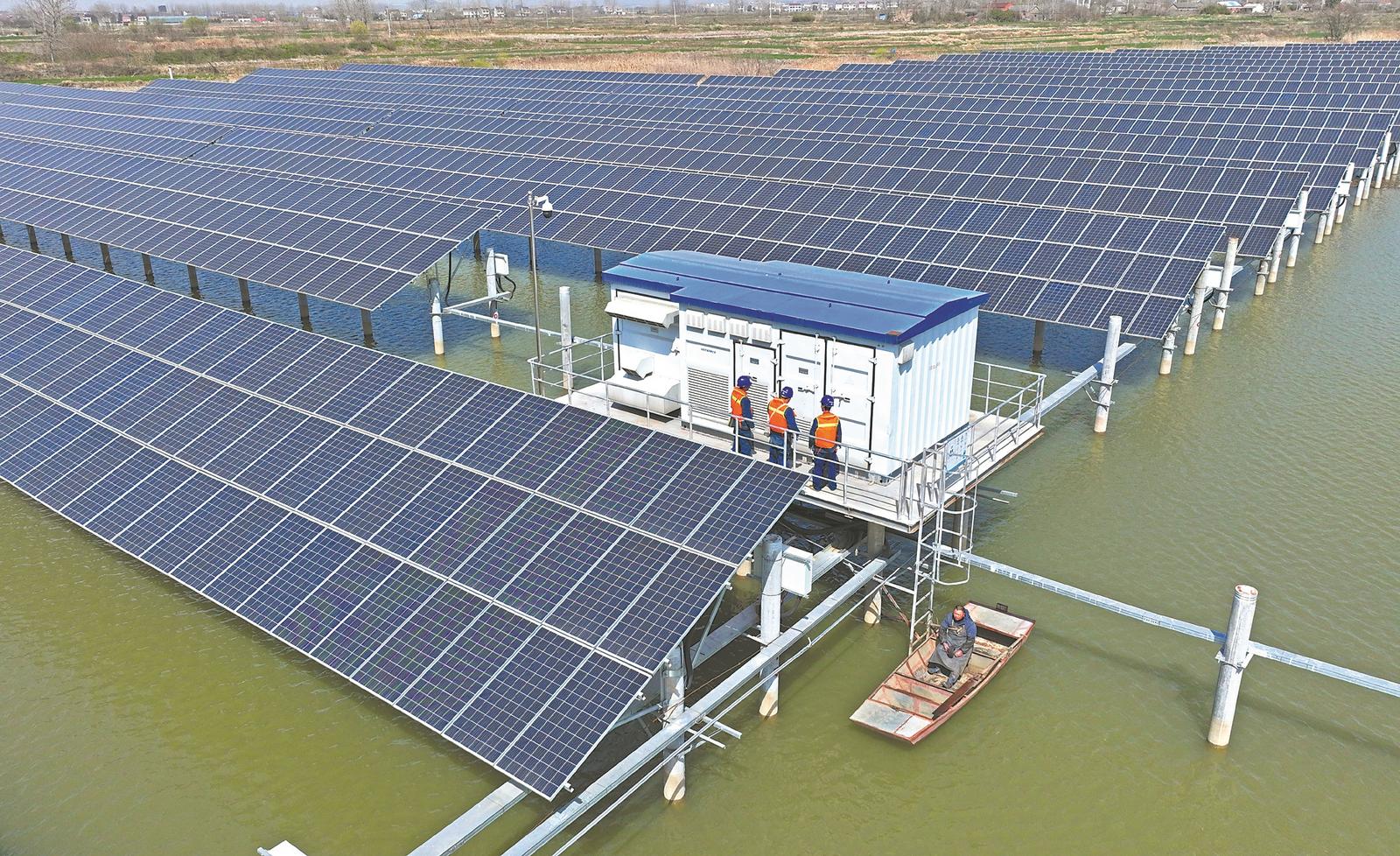 3月20日,国网滁州供电公司员工对来安县施官镇“渔光互补”光伏发电项目开展巡检服务。近年来,来安县追“光”逐“链”,推动产用结合,充分利用鱼塘、荒山坡地等发展光伏绿色清洁能源,走出了一条“生态+电力”互融共生发展之路。