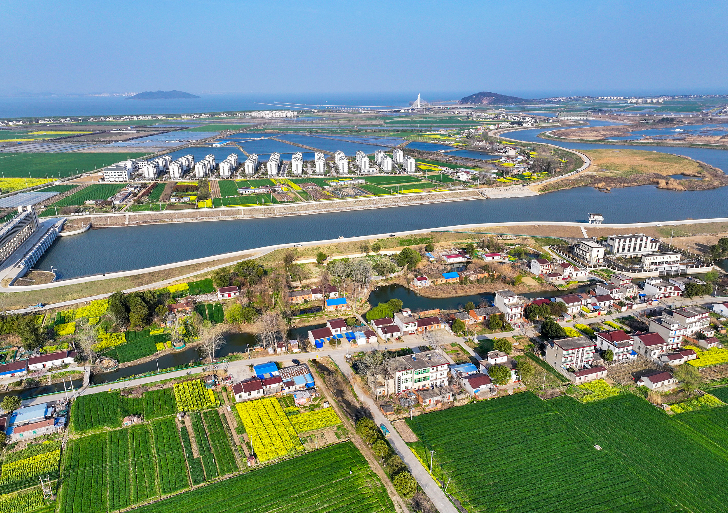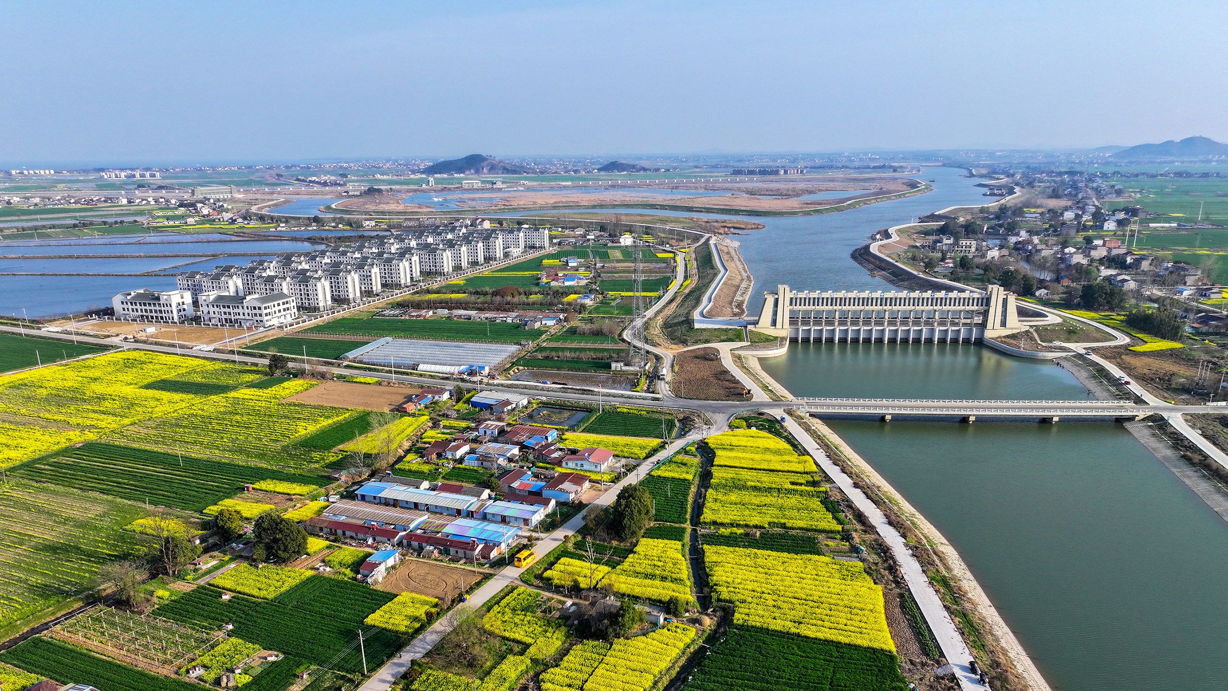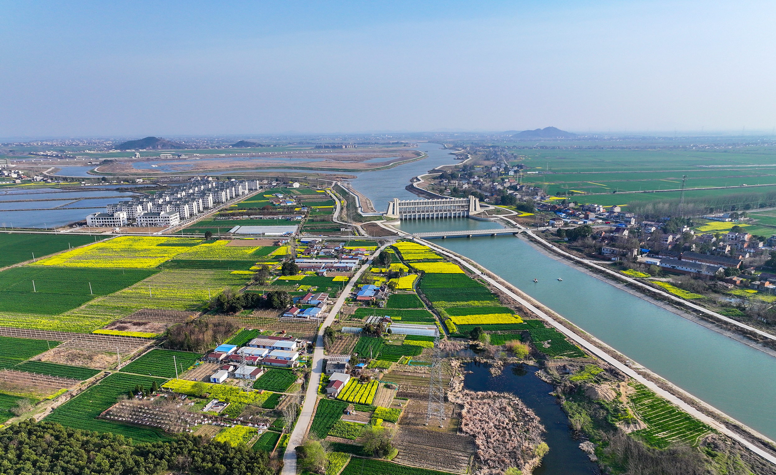 阳春三月,安徽省合肥市庐江县引江济淮工程白山船闸段沿岸,美丽的村庄与绿油油的麦田、金黄色的油菜花田交相辉映,宛若一幅展开的春天画卷。