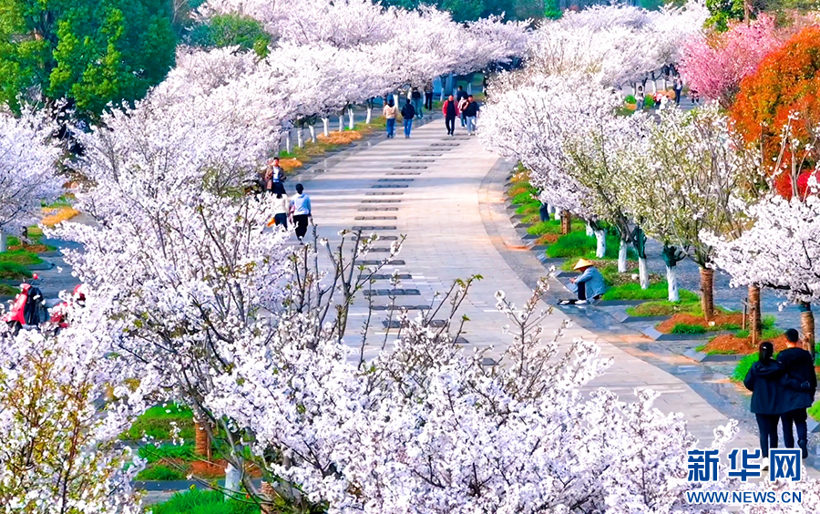 正是樱花烂漫时。在安徽省马鞍山市滨江文化公园,绵延的樱花将整条路染成一片云海,吸引众多市民前来打卡、拍照。新华网发(濮勇 摄)