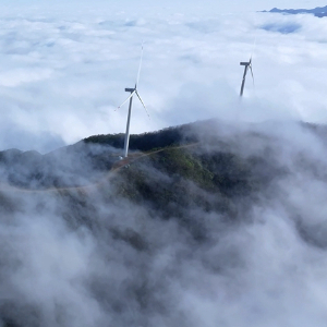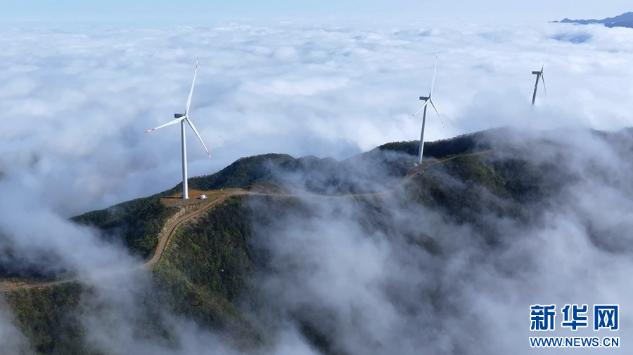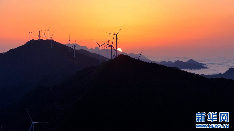 近日,在安徽省池州市东至县葛公镇红旗岭风电场,山巅耸立的风电机组与日出、朝霞、云海相映成景,共同绘就了一幅美丽的画卷。