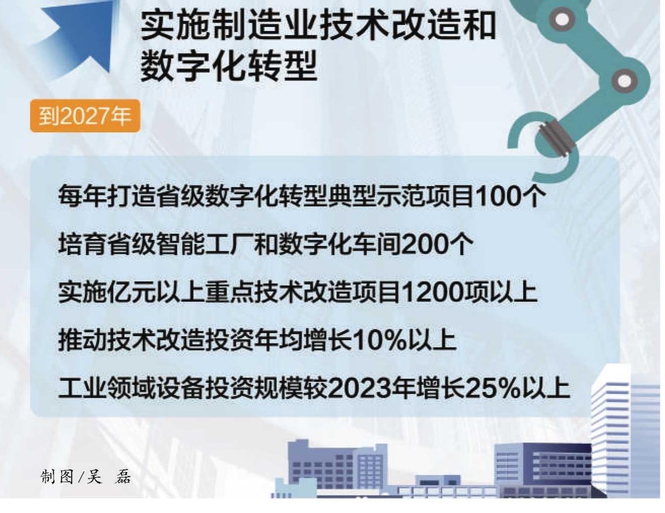 方案明确了主要目标,我省计划到2027年,每年打造省级数字化转型典型示范项目100个,培育省级智能工厂和数字化车间200个,实施亿元以上重点技术改造项目1200项以上,推动技术改造投资年均增长10%以上,工业领域设备投资规模较2023年增长25%以上;规模以上工业企业数字化研发设计工具普及率、关键工序数控化率分别超过90%、75%,实现规模以上工业企业数字化改造全覆盖;重点行业能效基准水平以下产能基本退出,主要用能设备能效基本达到节能水平,本质安全水平明显提升。