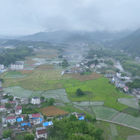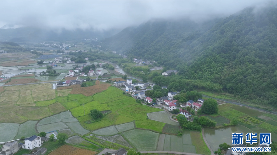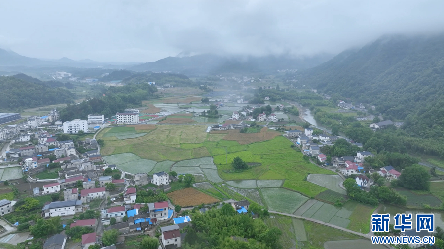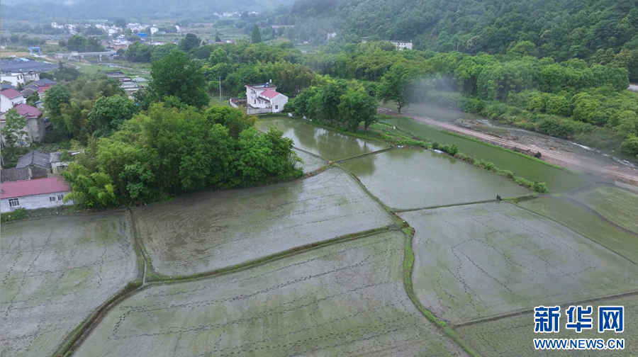 初夏的安徽省旌德县孙村镇,水田里已被种满了新插的秧苗,远远望去,山水秀美、田野青翠,仿佛美丽的画卷。