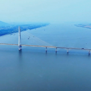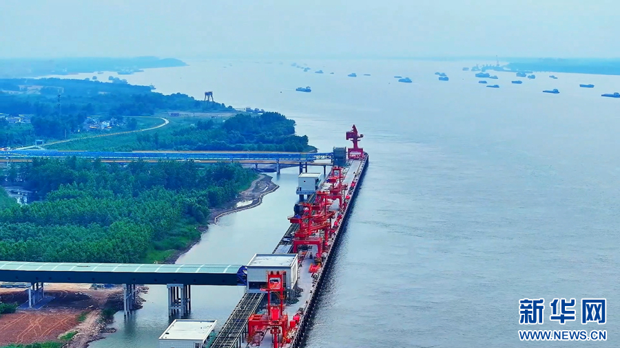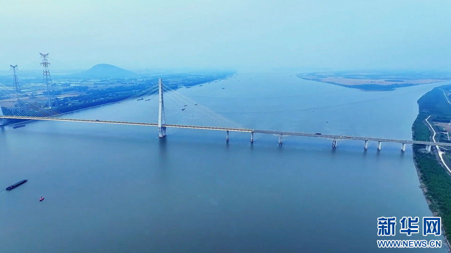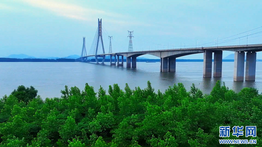 初夏时节,长江安徽池州贵池段,江面广阔、江水奔流。池州长江大桥雄伟壮观,秋江圩大堤滩涂绿意盎然,清澈的江水、绿意葱茏的岸边景观,共同描绘出一幅水清、岸绿、景美的生态画卷。