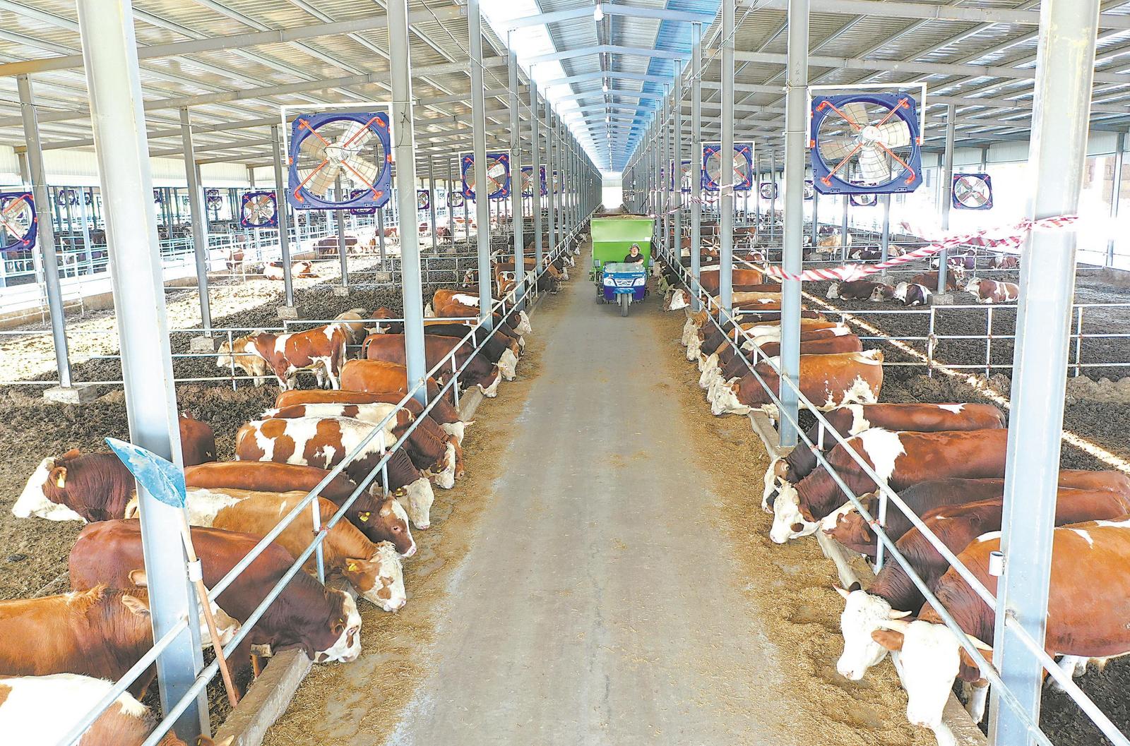 日前,位于蒙城县岳坊镇的安徽牛犇牧业有限公司生态养殖基地,工人正在用投料车饲喂黄牛。蒙城县大力实施“秸秆变肉”暨肉牛振兴计划,目前全县肉牛饲养量9万头,有力地助推了农民增收和乡村全面振兴。(通讯员 胡卫国 摄)