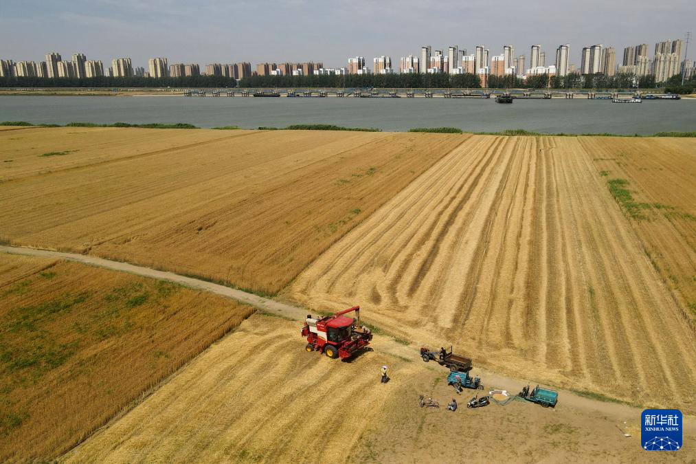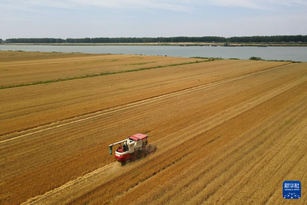 5月29日,在蚌埠市五河县朱顶镇淮河岸边,农机手驾驶收割机收割小麦。