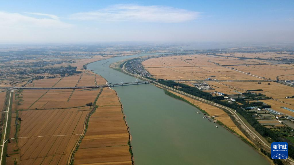 5月29日在蚌埠市五河县朱顶镇拍摄的淮河两岸的麦田(无人机照片)。