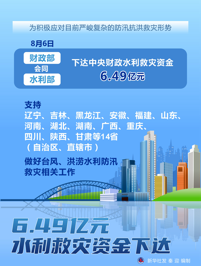 新华社北京8月7日电 记者7日从财政部了解到,为积极应对目前严峻复杂的防汛抗洪救灾形势,财政部6日会同水利部下达中央财政水利救灾资金6.49亿元,支持辽宁、吉林、黑龙江、安徽、福建、山东、河南、湖北、湖南、广西、重庆、四川、陕西、甘肃等14省(自治区、直辖市)做好台风、洪涝水利防汛救灾相关工作。中央财政重点对上述地区开展水利工程设施水毁修复、排查消除安全隐患等工作予以适当补助,助力保障水利工程设施主汛期安全运行。