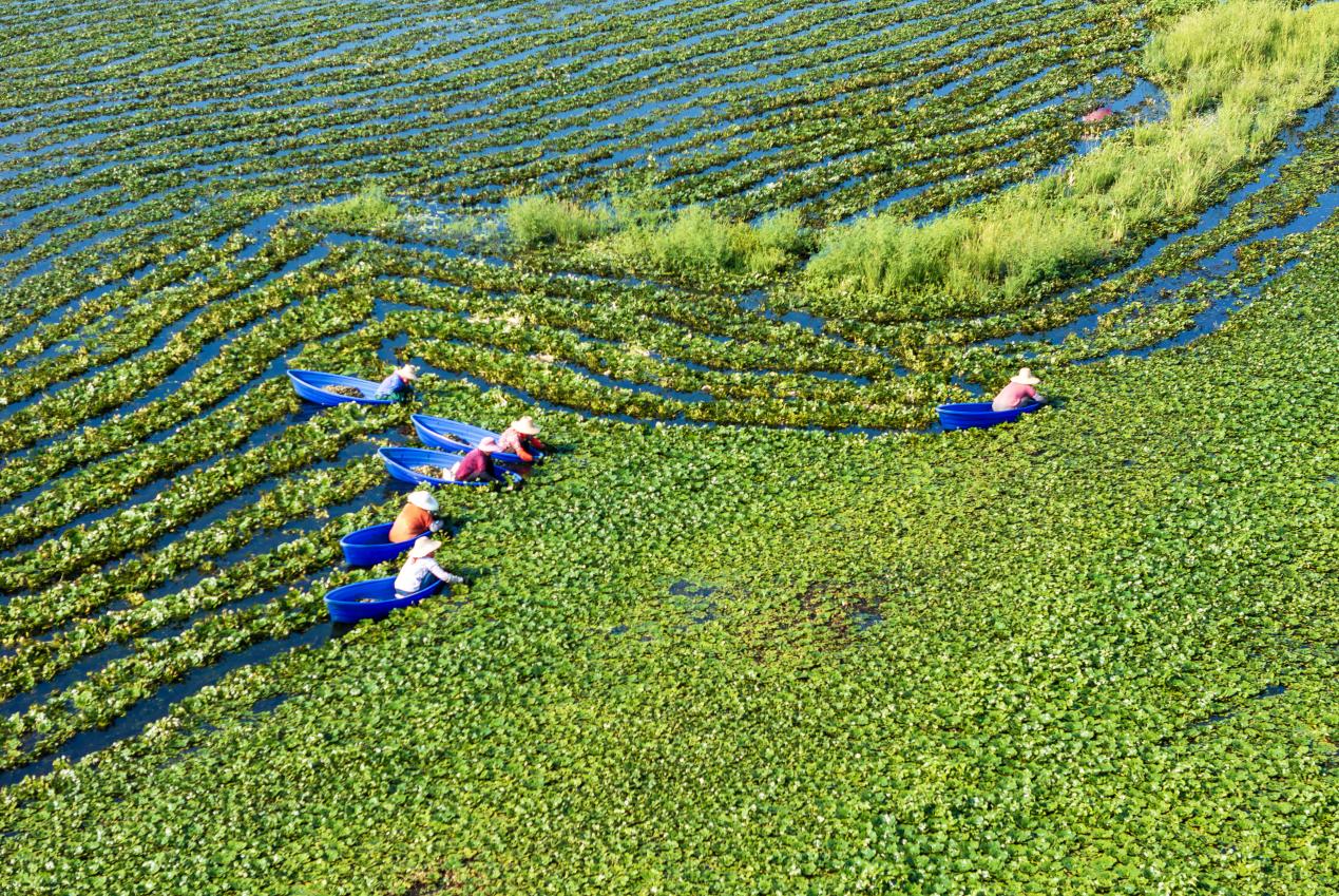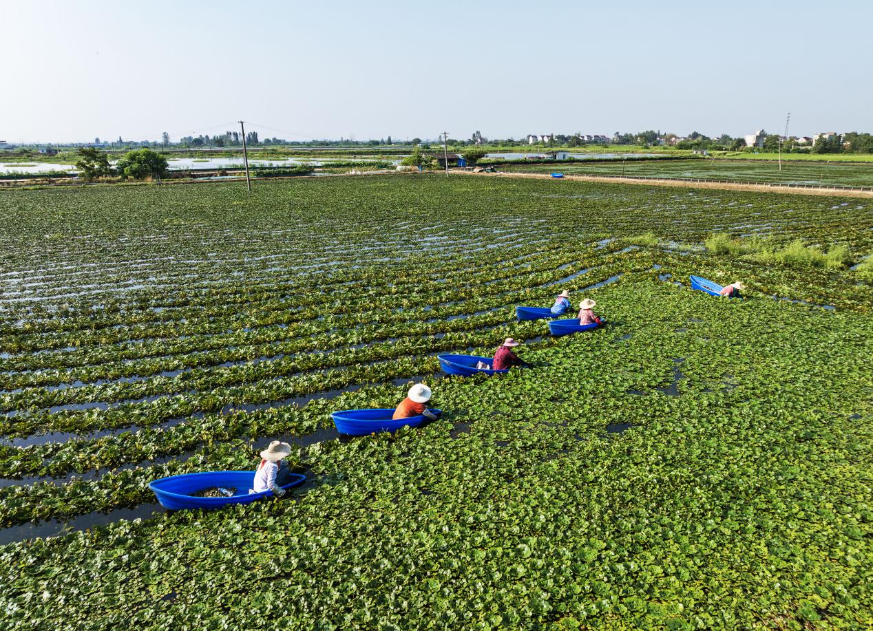 一大早,在当涂县大陇镇上禾村菱角种植基地,采摘工们正划着小船穿行在菱角塘里忙着采摘菱角,工人们熟练地将菱角菜藤一条条拉起,顺藤摸“角”,一只只鲜嫩的菱角被装入编织筐中。