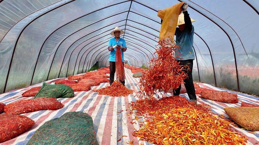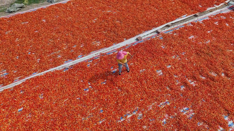 安徽省亳州市谯城区古城镇的万亩朝天椒喜获丰收,田间地头随处可见农户们采收辣椒的忙碌身影,晒秋现场一派喜人的丰收景象。