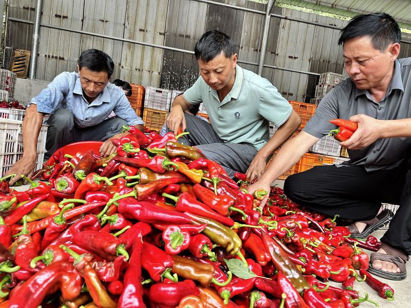 八棚村在村部旁设立了一处辣椒交易市场,称重、分拣、装箱、上车……一套流程走完,椒农们的劳动成果就会“兑现”成收入。“今年种了8亩多,每天可采300公斤,现在一共卖出4000公斤了。”朱治水算了一笔账,按今年每公斤均价5.4元算,一天就可收到1000多元。