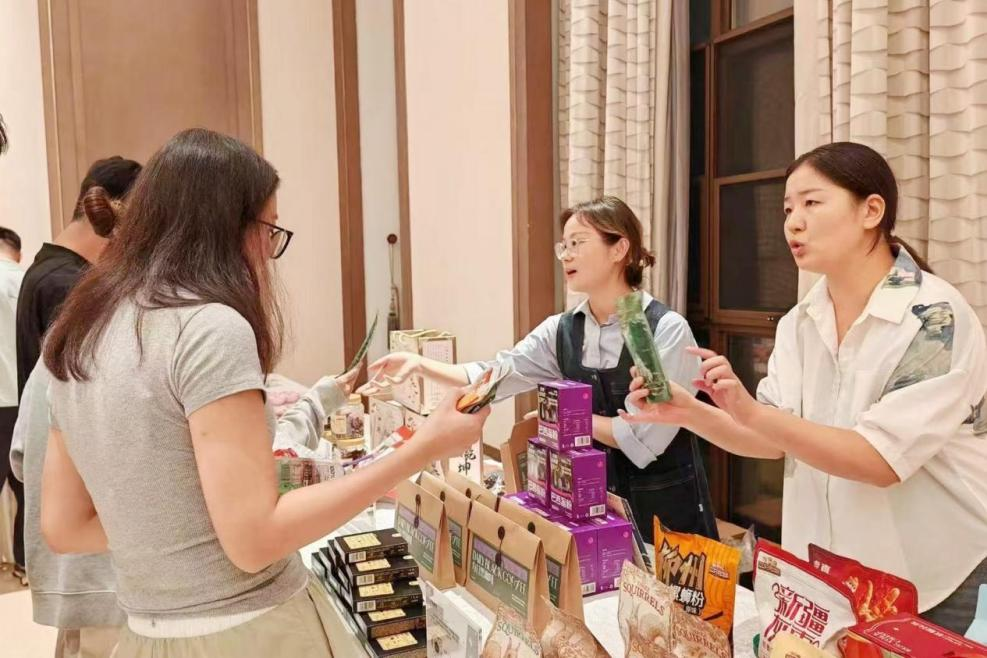 设在安庆市一酒店大厅的安庆名特优土特产展销区,传承近20年的安庆果不离芝麻糊、口感甜脆的太秋甜柿吸引了众多外籍选手品尝采购,供不应求。新华社客户端发