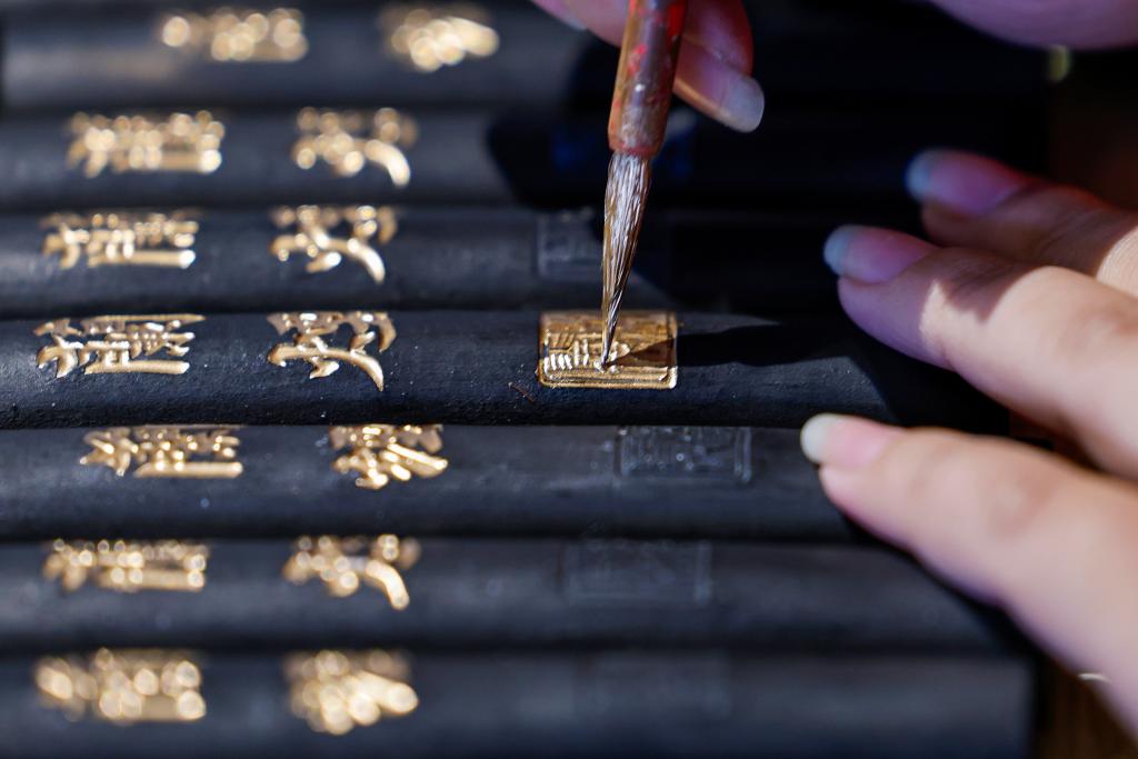 学生在安徽省行知学校徽墨实训课上为徽墨描金(11月27日摄)。