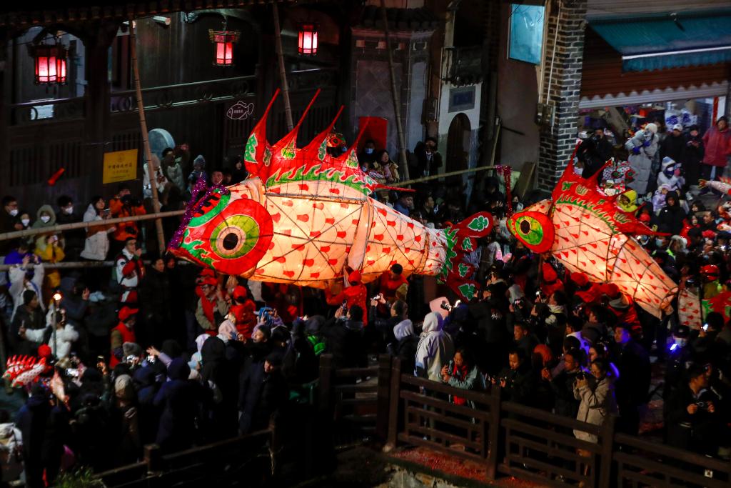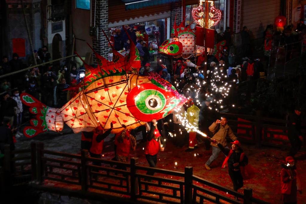 黄山市歙县,汪满田鱼灯表演队伍在村中嬉游祈福(2月22日摄)。