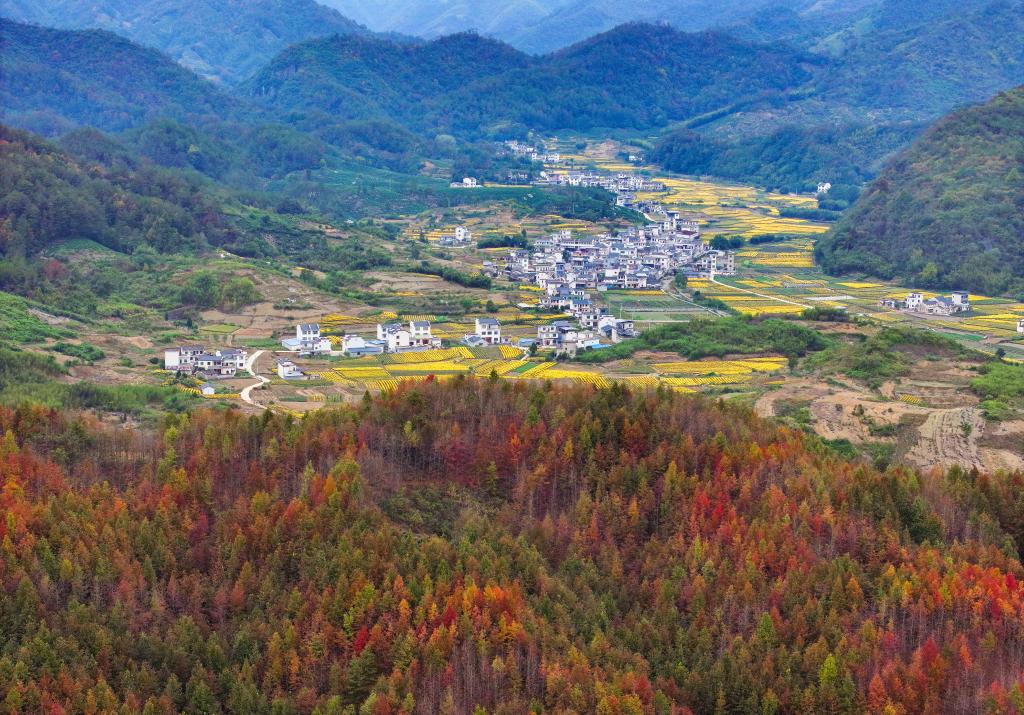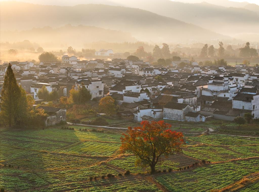 “遥望山川色,莫不乐丰收”。秋日丰收时节的徽州,层林尽染,叠翠流金,斑斓的乌桕树在青山的映衬下愈发多姿,收获的作物犹如缤纷的调色盘。这多彩交融的情景宛如一首无声的诗、一幅绚丽的画。