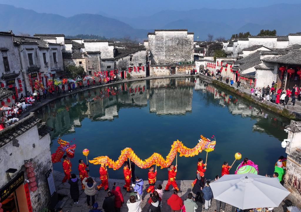 民俗舞龙表演队伍在黄山市黟县宏村巡游(2月10日摄,无人机照片)。