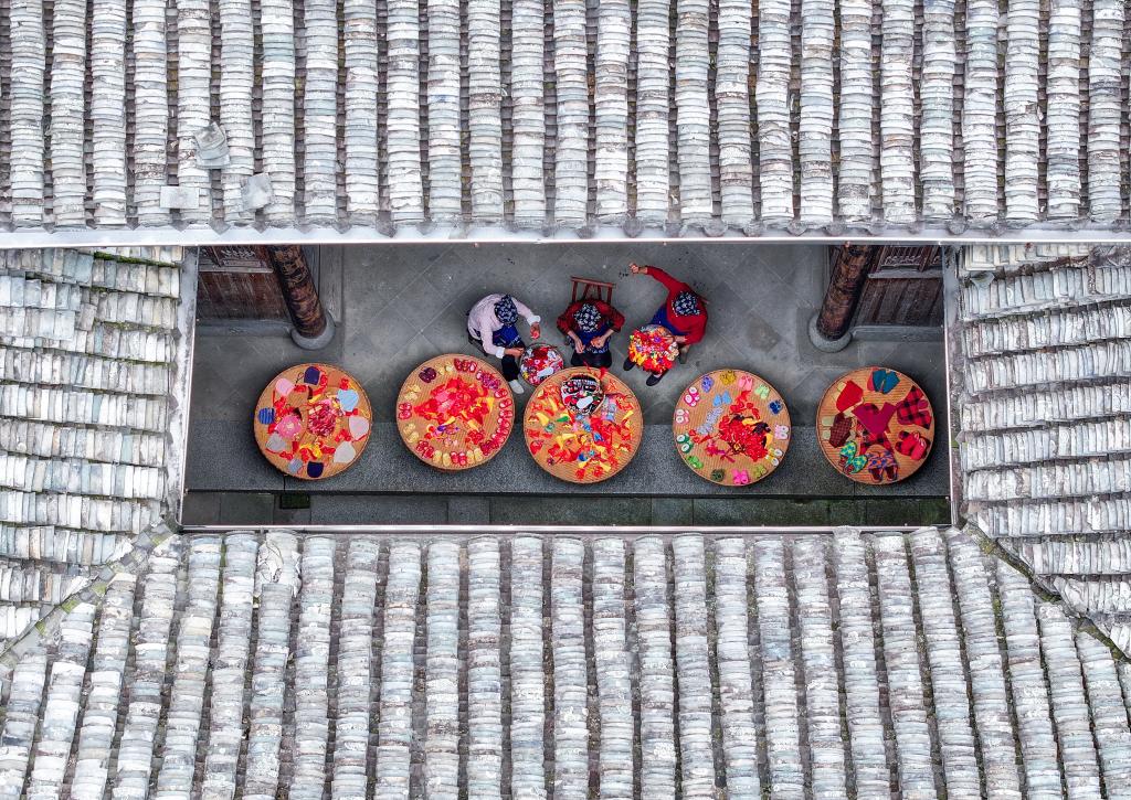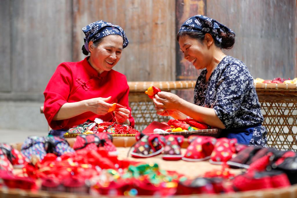 黄山市歙县许村镇许村,村民在手工缝制当地非遗饰品“徽州端午锦”(6月4日摄)。