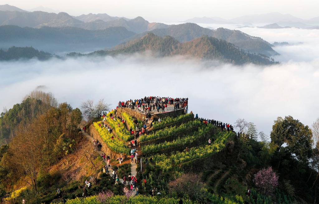 游客在黄山市歙县石潭村欣赏春日云海(3月20日摄,无人机照片)。