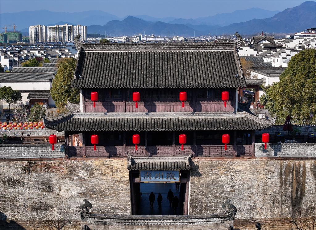 大红灯笼高挂扮靓徽州古城(1月25日摄,无人机照片)。