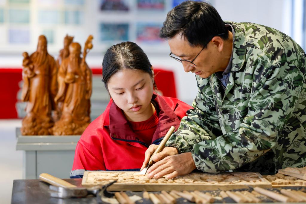 安徽省行知学校学生程俊文(左)在老师吴侠芳的指导下学习雕刻技术(11月27日摄)。