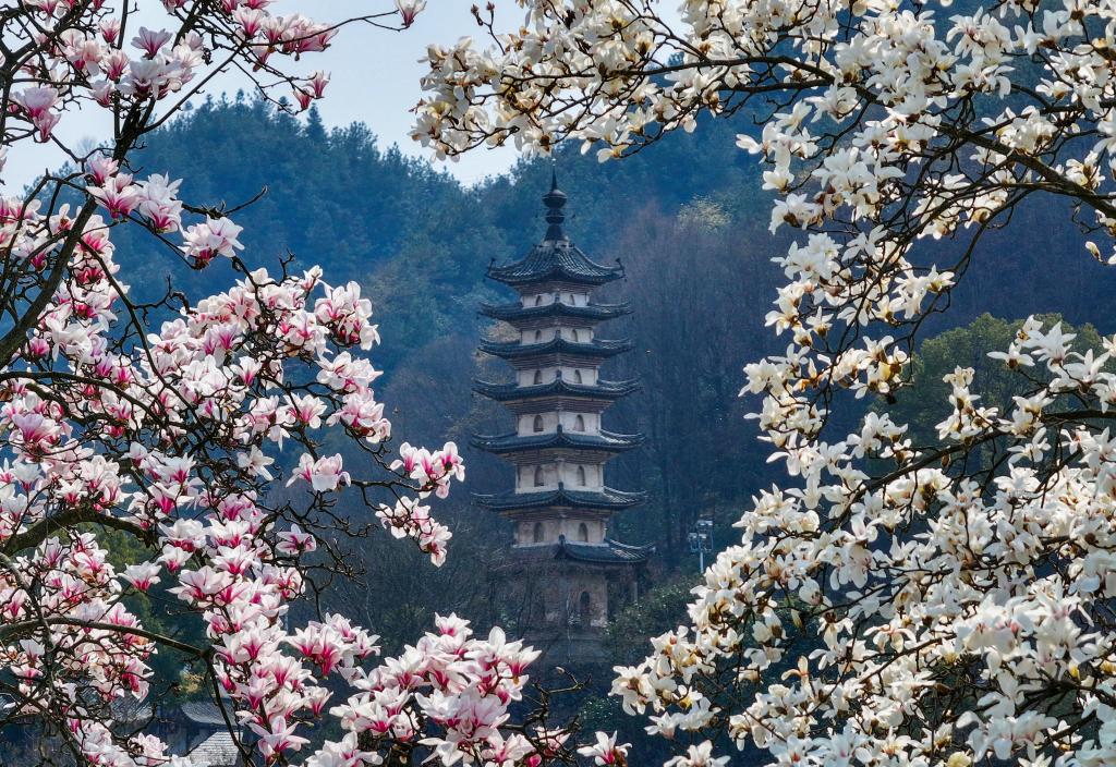 黄山市歙县新安江畔多景园的玉兰花(3月12日摄,无人机照片) 。