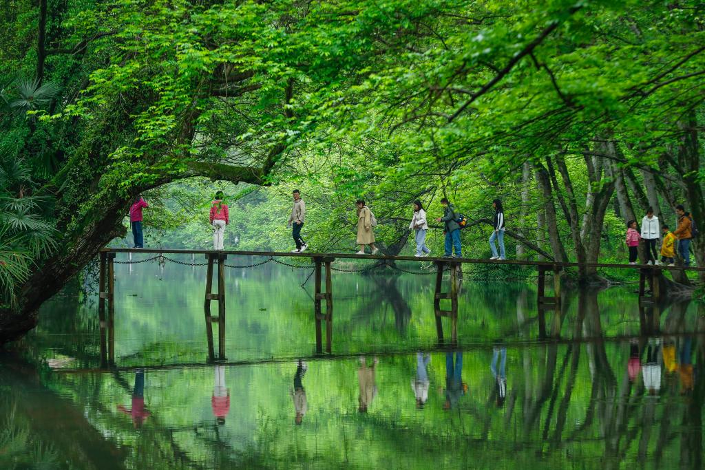 游客在黄山市徽州区西溪南湿地踏青赏景(4月7日摄)。