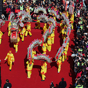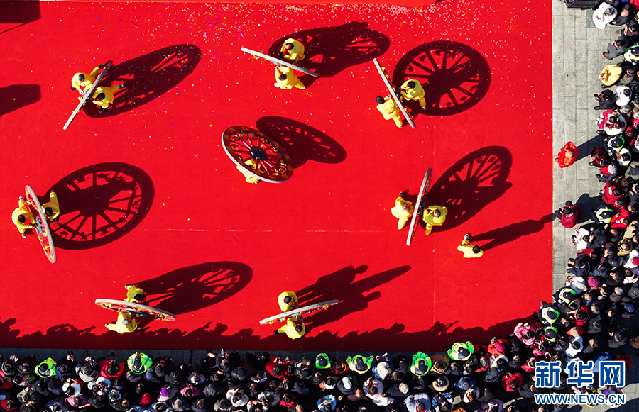 1月29日,非遗 “轩辕车会”在安徽省黄山市黄山区六角楼广场表演(无人机照片)。