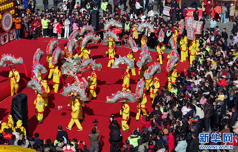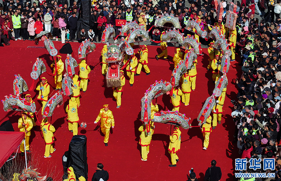 1月29日,非遗 “永丰龙灯会”在安徽省黄山市黄山区六角楼广场表演(无人机照片)。