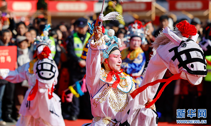 1月29日,非遗 “跳竹马”在安徽省黄山市黄山区六角楼广场表演。