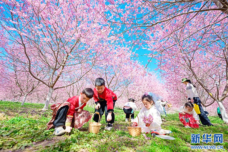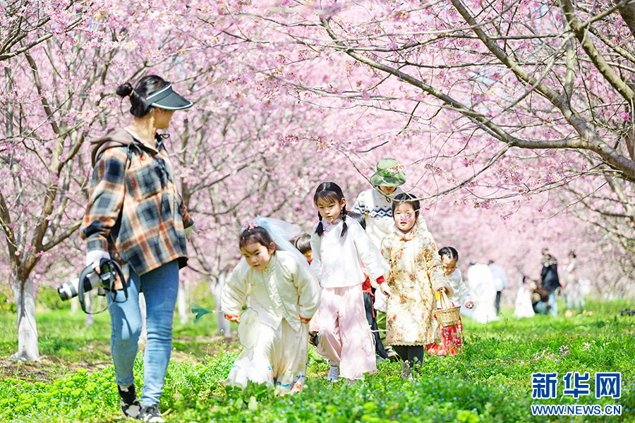 3月21日,小朋友们在安徽省滁州市全椒县马厂镇龙山千亩樱花园踏青研学。