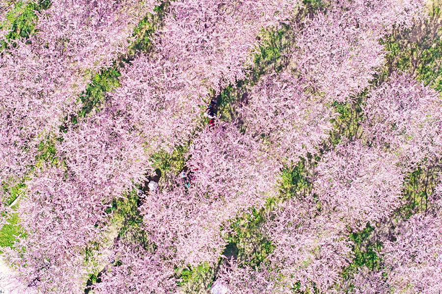 3月21日,安徽省滁州市全椒县马厂镇龙山千亩樱花迎来盛放期,吸引游客前来观光游玩(无人机照片)。