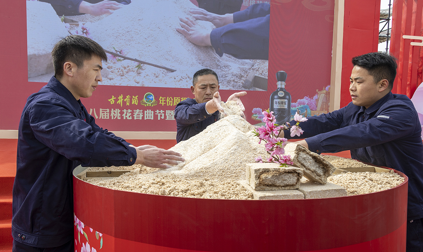 “阳春三月桃花开,温和湿润原生态,千年曲根薪火传,非遗技艺桃花曲……”在现场,古井贡酒制曲师傅们展演桃花春曲非遗制曲古法技艺。从堆麦粮、撒曲根,到制曲、润曲,再到成曲,一系列严谨且精细的工序,在师傅们手中有条不紊地进行,让现场嘉宾领略到古法制曲的独特魅力,彰显出古井人对传统工艺的坚守与创新。