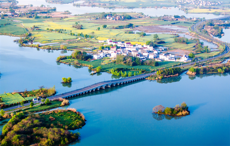 4月6日,安徽省芜湖市南陵县许镇镇奎湖省级湿地公园,错落有致的民居与田野、湖水、道路等交相辉映,构成了一幅春意盎然的生态画卷。