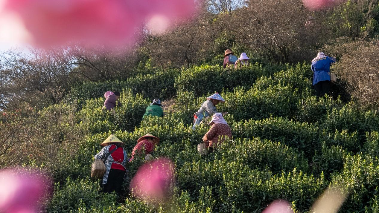 眼下,旌德县俞村镇白云山生态茶园迎来一年中最美的时候,一拢拢绿茵茵的茶树间朵朵映山红正悄然绽放,茶叶亭亭玉立、郁郁葱葱,青山绿树间,嫣红的映山红点缀其间,朵朵芬芳,随风摇曳,与蓝天、茶树交相辉映。排排茶树间,采茶工人分散其间,手起手落,采下一片片嫩叶。茶与花、红与绿、人与景,碰撞出一幅生机勃勃的田园风光图。